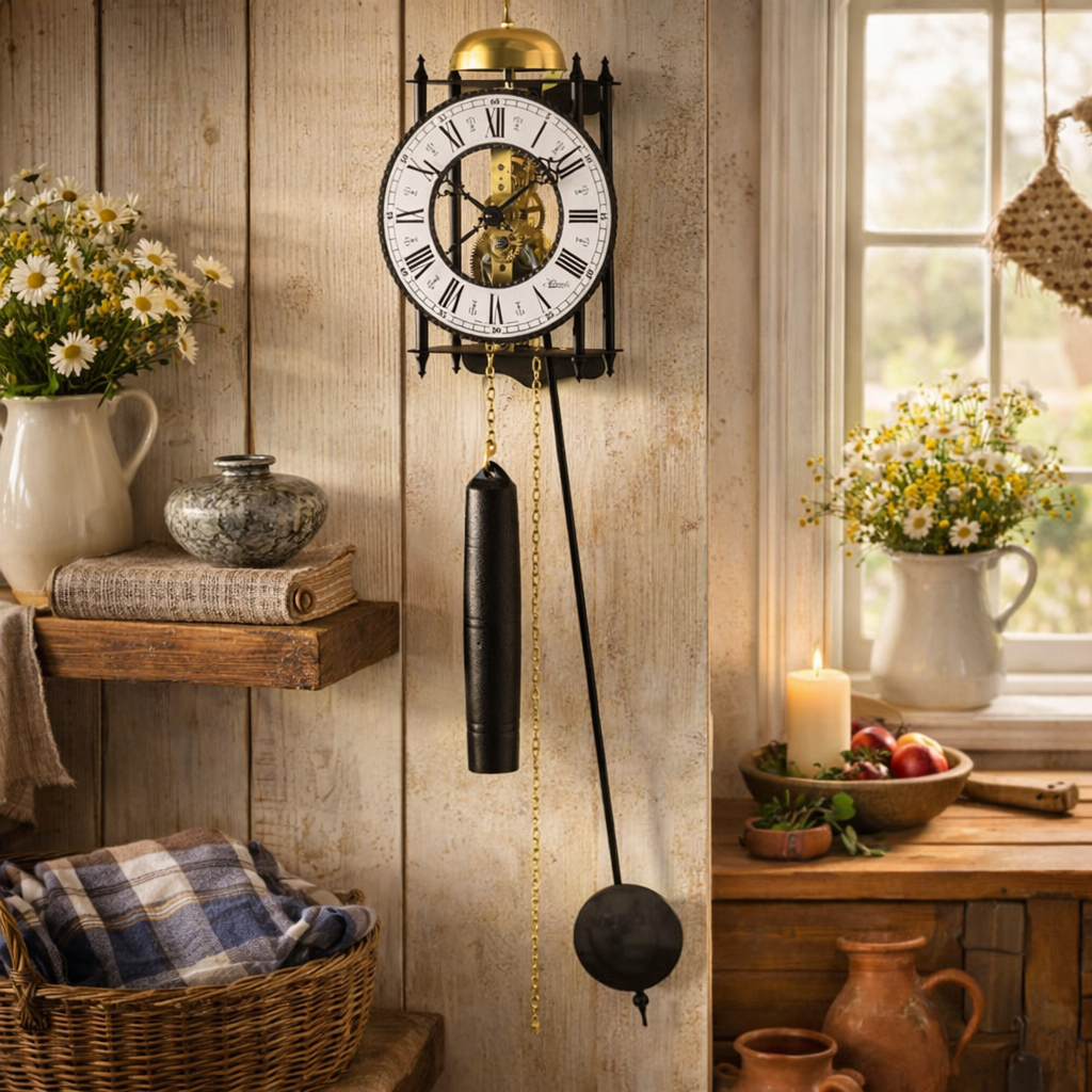 Roman numerals, ornate black hands, and a wrought-iron cage frame complete the look. The 8-day movement delivers the soothing tick of true analog time—elegant on mantels, libraries, or offices.
